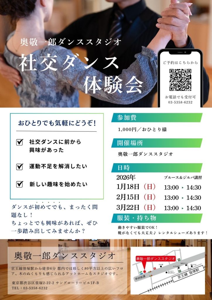 「ダンスは敷居が高そう」「運動はしたいけどジムは続かない」そんな方にこそ、社交ダンスはおすすめです。音楽に合わせて体を動かし、自然と姿勢が整い、楽しみながら運動不足を解消できるのが魅力。今回は、ダンス未経験の方でも安心して参加できる社交ダンス体験会を開催します。